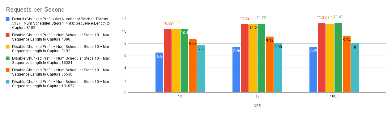 --num-scheduler-stepsto a value between 10 and 15 to optimize GPU utilization and performance. - Prefix Caching: Combining prefix caching with chunked prefill can enhance performance in specific scenarios. However, if user requests have a low prefix caching hit rate, it might be advisable to disable both chunked prefill and prefix caching.